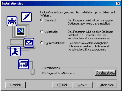 Auswahl der Kundenkomponenten wie z.B. Anwendungen anderer Anbieter, die in den Netscape 6-Client eingebunden werden sollen